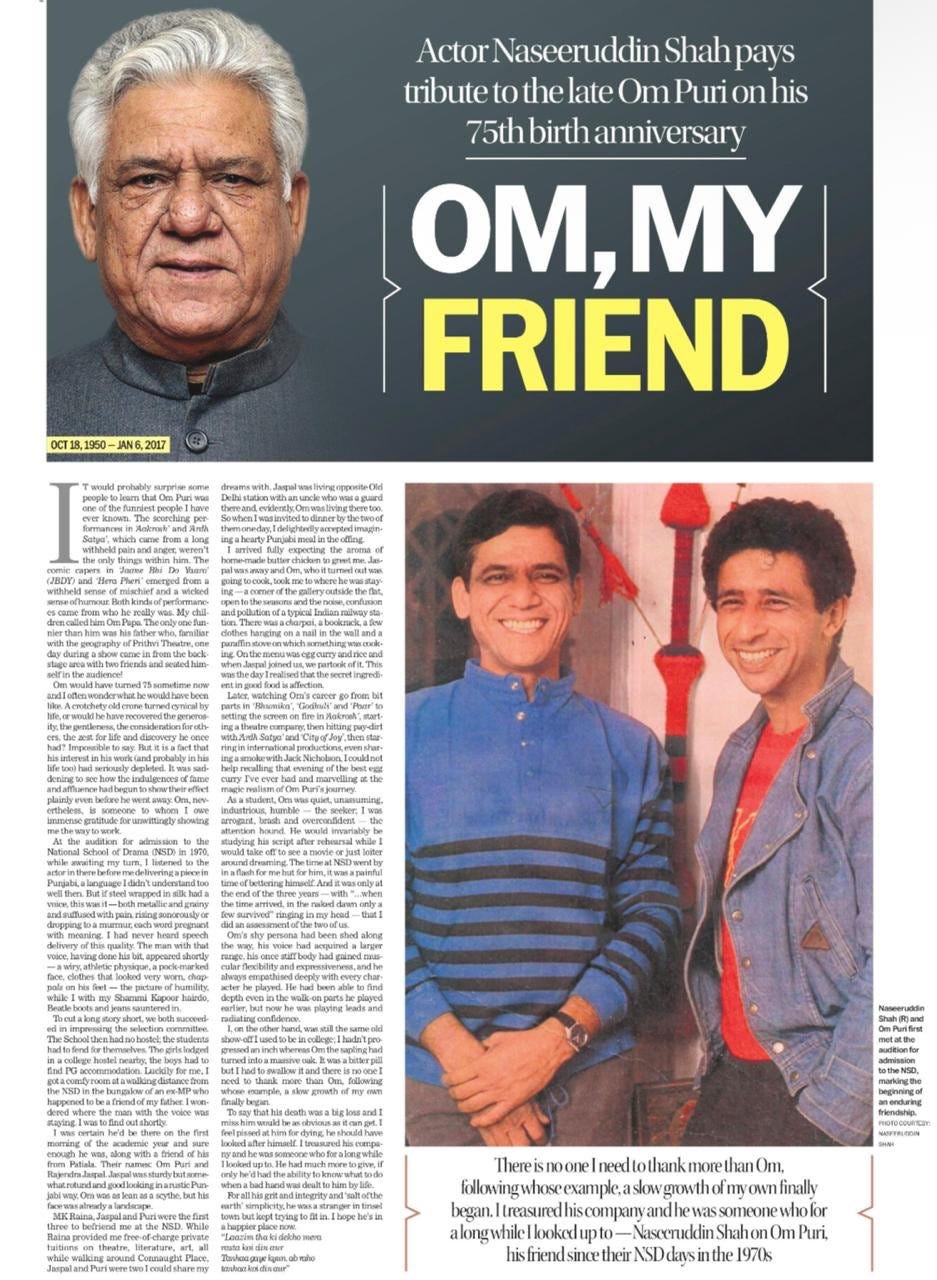 We don’t usually open with entertainment, but this article in The Tribune is very special: Naseeruddin Shah remembers Om Puri, his friend from the National School of Drama, who would have turned 75 last weekend. Shah is one of India’s finest writers but passed himself off as a great actor, until he outed himself with his extraordinary memoir, And Then One Day (Hamish Hamilton, 2014).