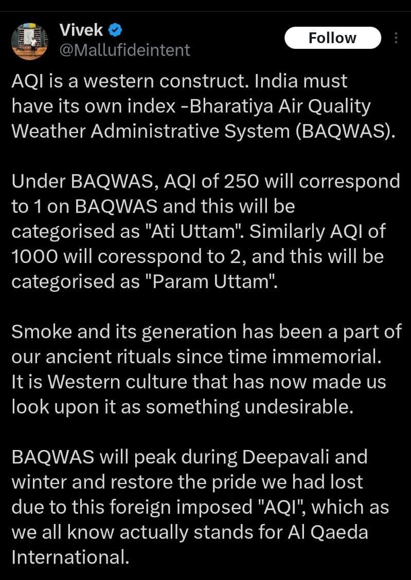 AQI (Air Quality Index) is a serious matter in heavily polluted Delhi, and is followed as passionately as cricket scores and lottery numbers at this time of year, when the smog of Diwali blots out the skies. This year, public attention is on two institutions: the Supreme Court, which has allowed the use of oxymoronic ‘green crackers’ in Delhi, and the chief minister of Delhi, who lurched between AQI, AIQ and IQ (what, no AI?), in a manner designed to assure all that she knows nothing about the matter.